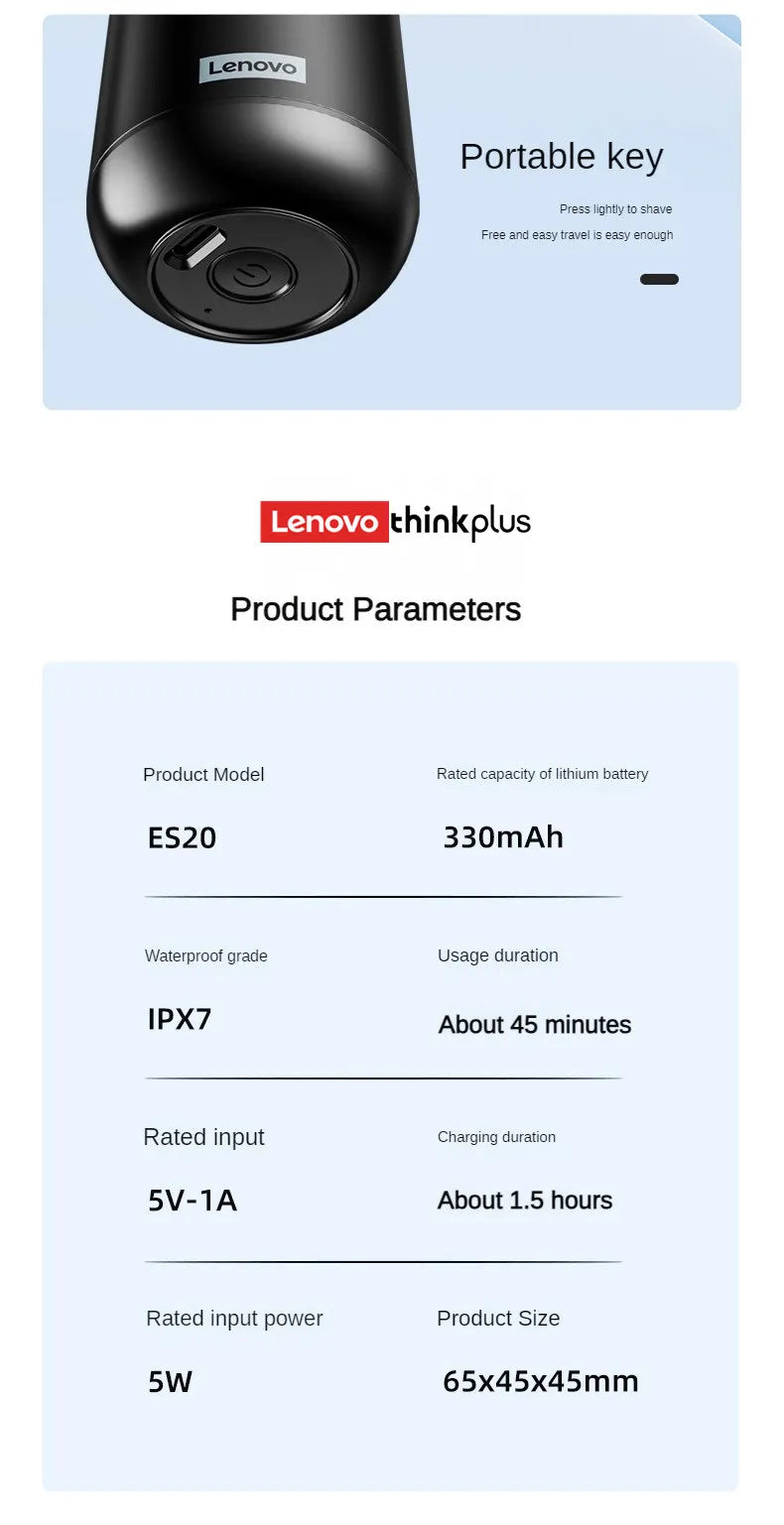 The Lenovo Electric Shaver ES20 combines precision engineering with everyday practicality. Its high-speed motor delivers a swift, efficient shave while the stainless steel alloy blade maintains superior sharpness through repeated use. IPX7 waterproof certification enables complete body washing and effortless rinsing under running water. With approximately 45 minutes of runtime per charge and a rapid 1.5-hour charging cycle, this shaver integrates seamlessly into your grooming routine. The compact metal construction ensures durability and reliable performance, making it an ideal choice for discerning users who value both quality and convenience.