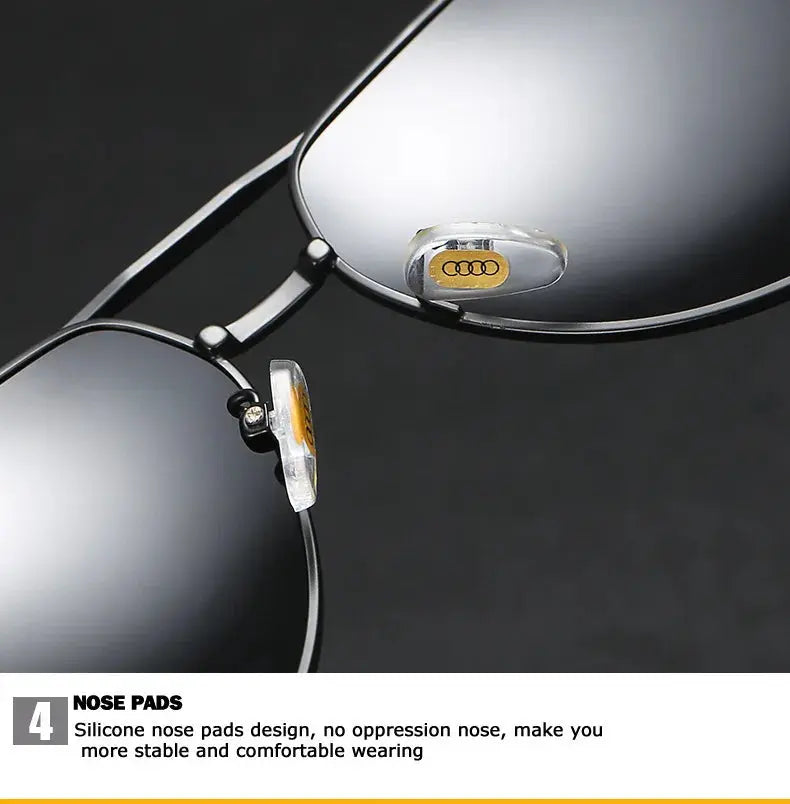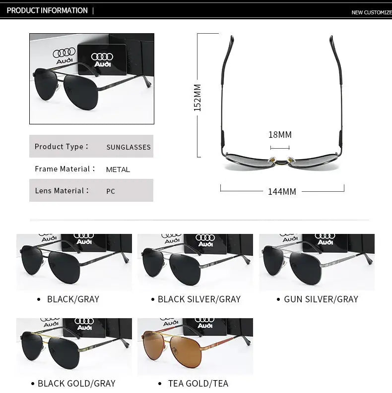 Engineered for the discerning traveler and driver, these Audi aviator sunglasses combine timeless retro styling with advanced optical technology. The polarized TAC lenses deliver UV400 protection and anti-reflective properties, effectively reducing glare during driving and outdoor activities. Crafted from lightweight alloy, the 61MM x 52MM frame sits comfortably for extended wear. CE-certified and available with or without original factory packaging, these versatile glasses transition seamlessly from road to leisure. A refined choice for men seeking both protection and classic aesthetic appeal.