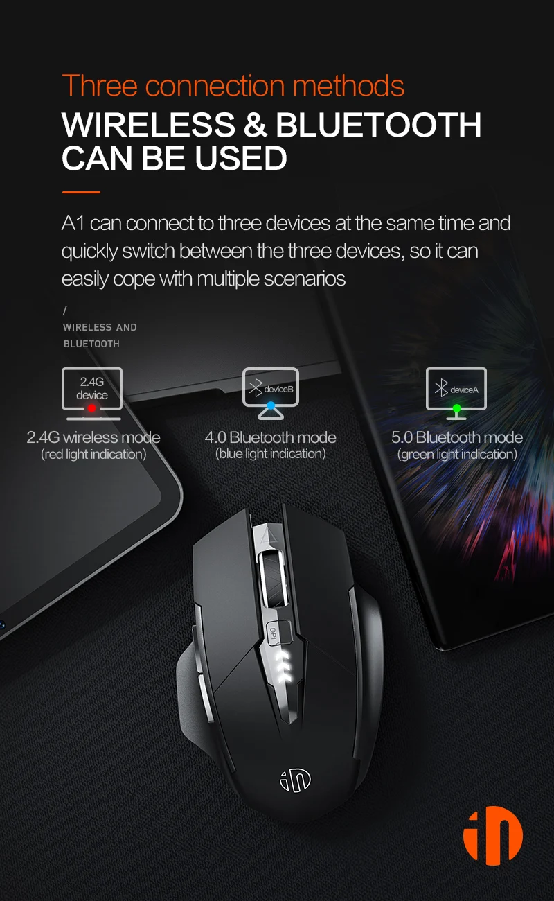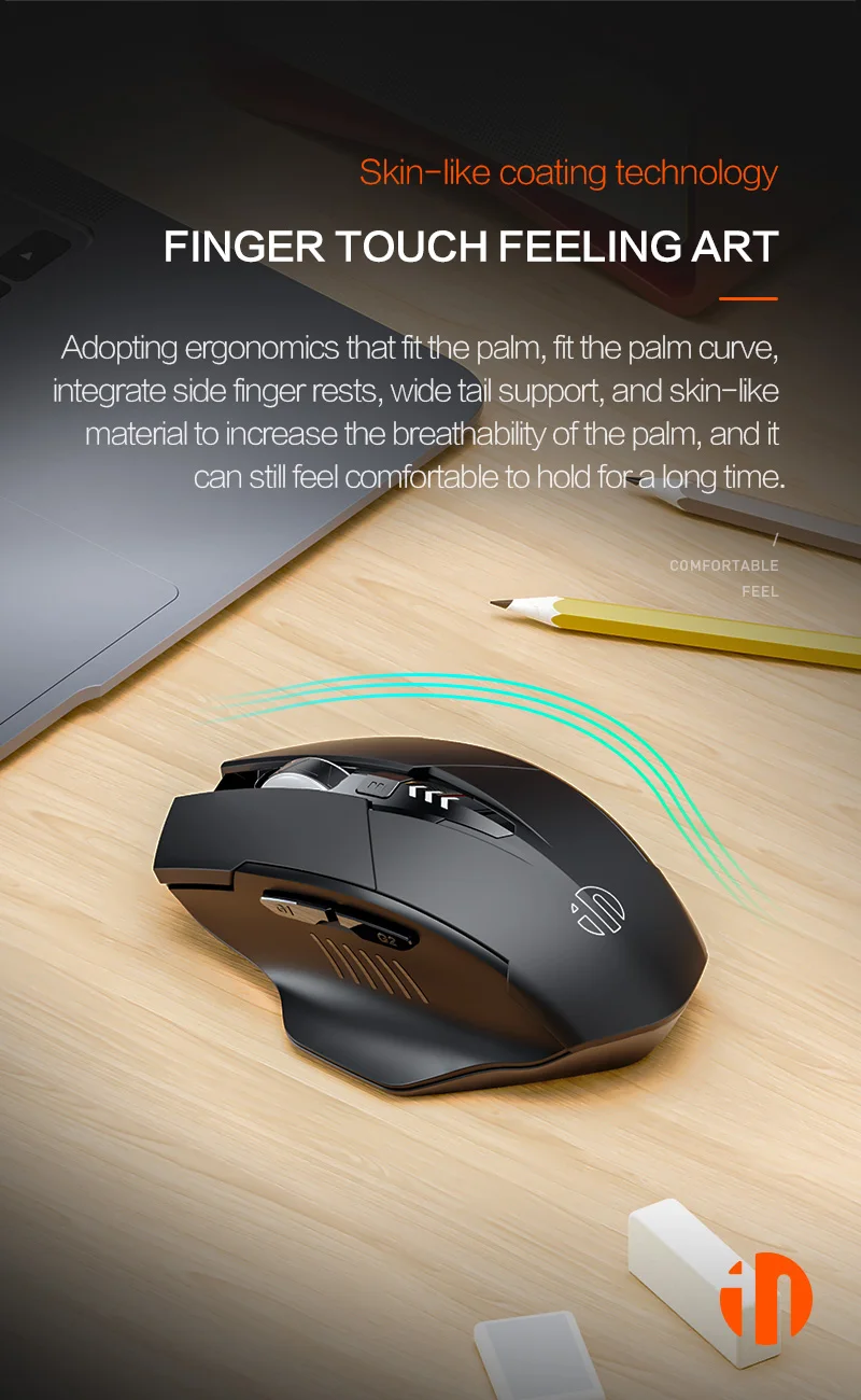 Unlock peak productivity with the INPHIC A1 Wireless Bluetooth Mouse. This trimode, rechargeable mouse effortlessly pairs with your devices via Bluetooth 5.0, 2.4G wireless, or USB, making seamless transitions a breeze. Its ergonomic design and skin-friendly coating ensure perfect comfort even during lengthy sessions.