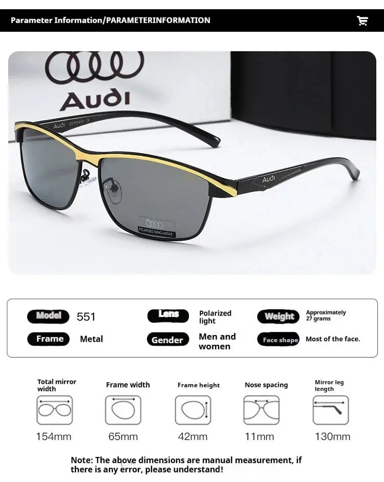 Engineered for the discerning driver and outdoor enthusiast, these AUDI sunglasses deliver sophisticated protection with polarized lenses that eliminate glare and block harmful UV400 rays. The lightweight alloy frame features a timeless rectangular silhouette, while TAC lenses provide anti-reflective clarity for driving, cycling, and travel. Measuring 65MM × 42MM, they balance style with functionality. CE-certified and available with or without original factory packaging—choose the option that suits your needs.
