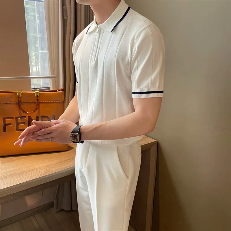 Elevate your wardrobe with our Luxury Knit Zipper Polo Shirt for Men, designed for both business and leisure. This stylish short sleeve polo features a solid color, making it a versatile addition to any outfit. Crafted with premium quality knitwear, this shirt fits sizes M to 3XL, showcasing a contemporary Korean retro flair.
