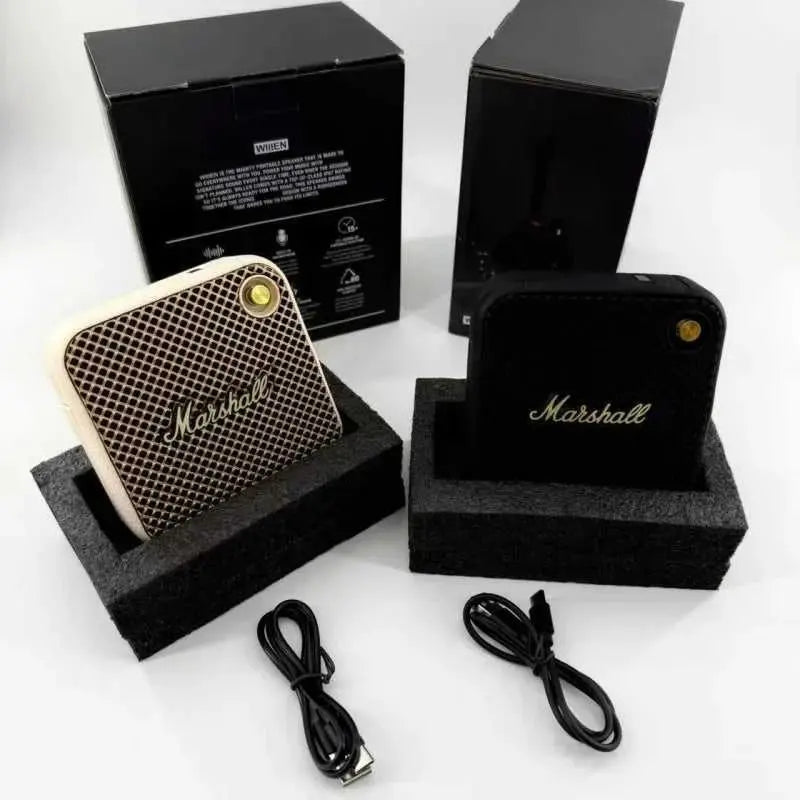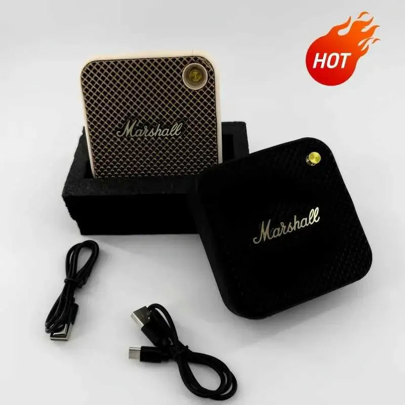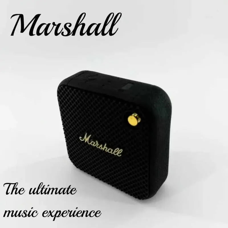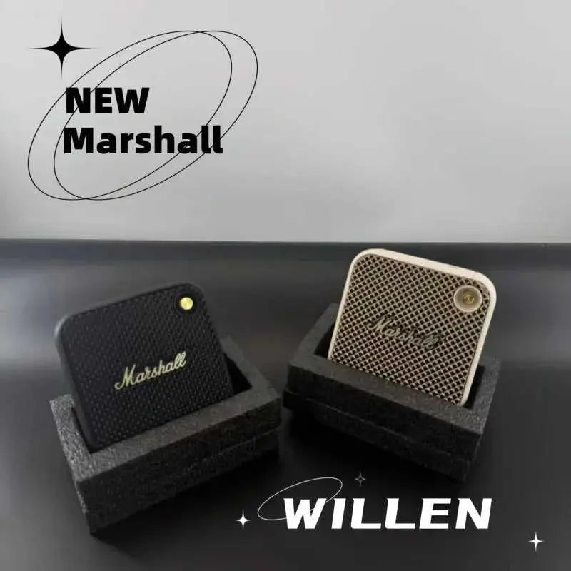 Compact Marshall Willen Bluetooth speaker delivers powerful stereo bass in a portable design. Features full-range audio (60Hz-23KHz), USB charging, and wireless connectivity up to 20 meters. Built with durable metal construction and weighing just 360g, it's ideal for outdoor adventures and everyday listening. App support enhances functionality for music lovers on the go.