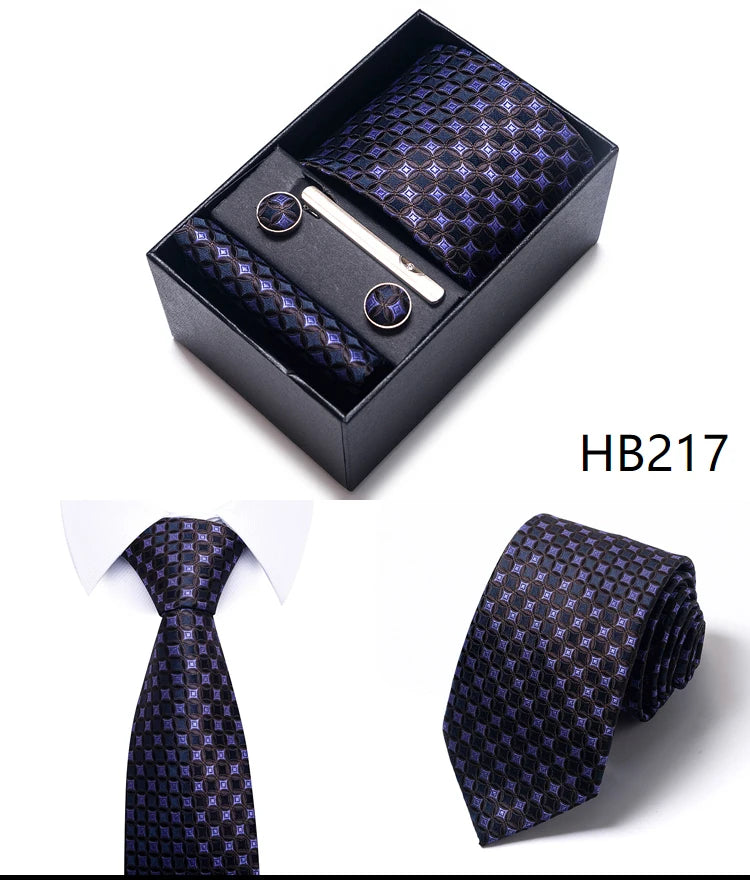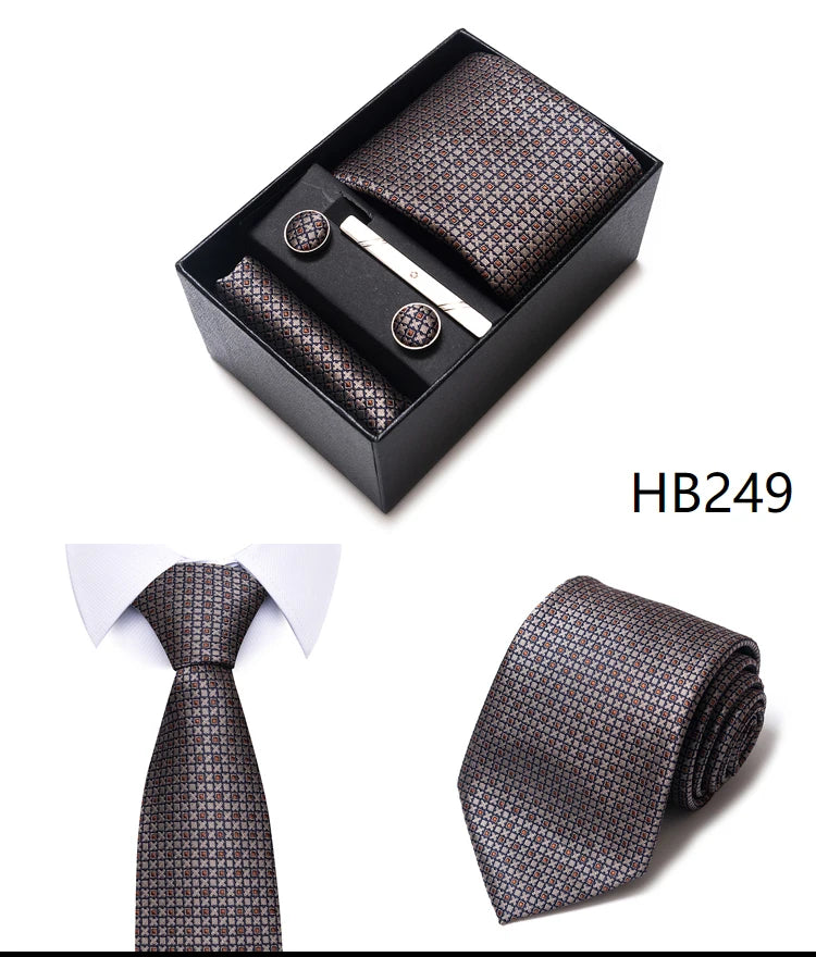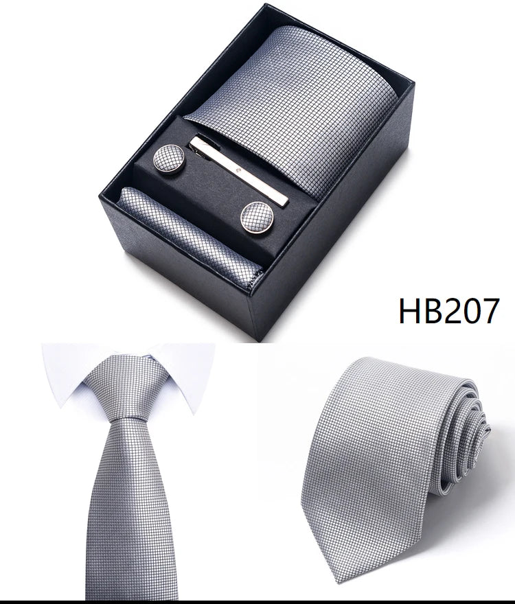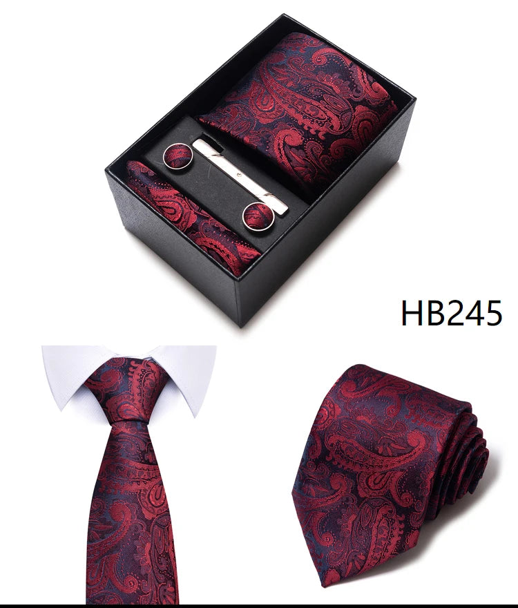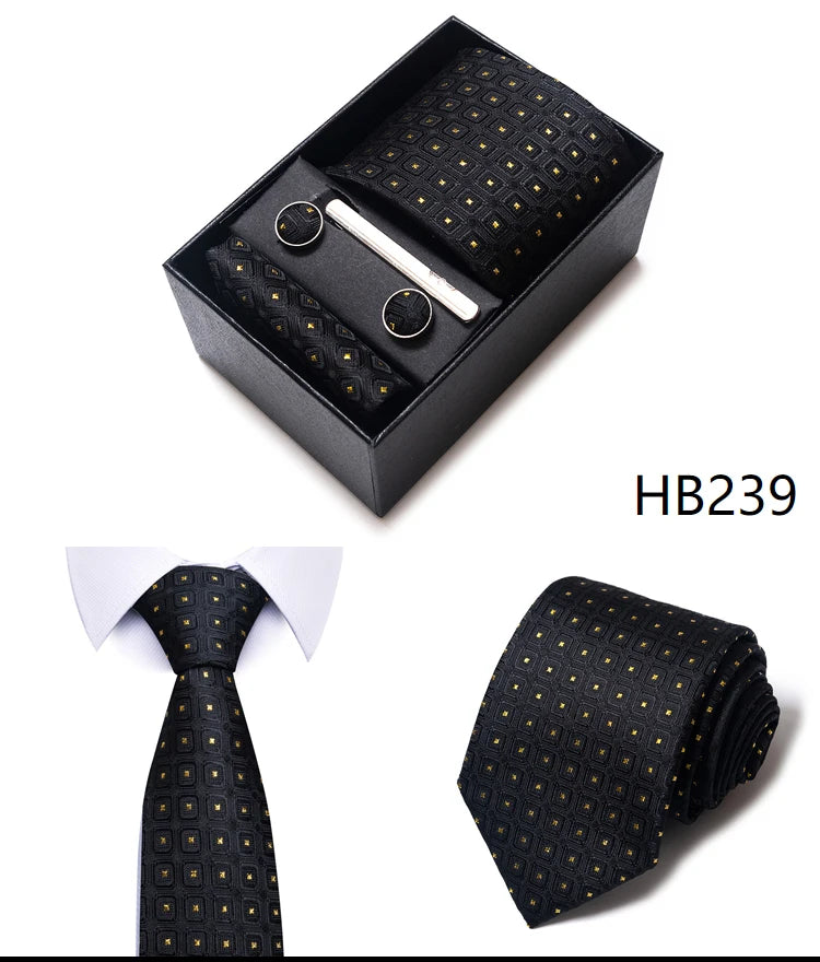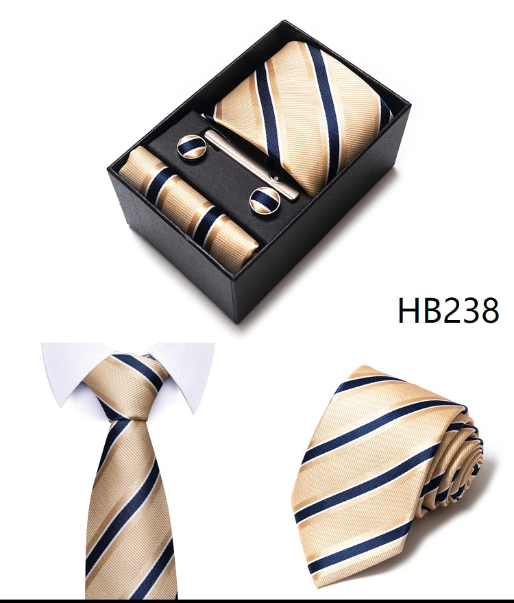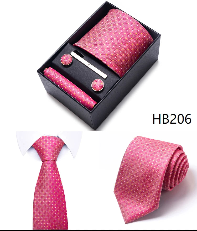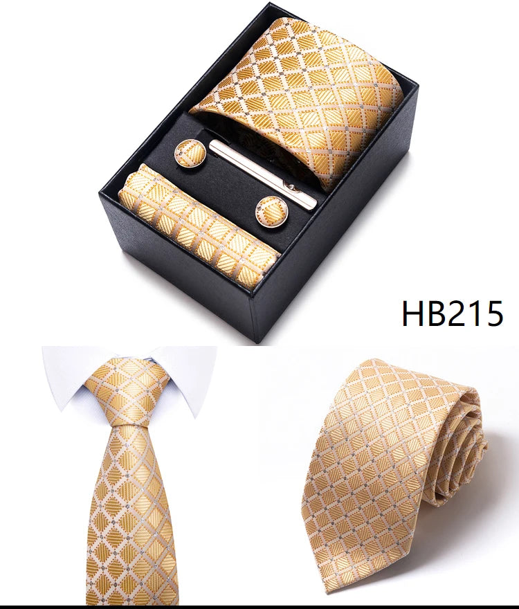 Elevate your formal wardrobe with this sophisticated silk tie set from VanGise. Crafted from 100% jacquard-woven silk, this Italian-designed collection includes a classic neck tie, matching handkerchief, and two polished cufflinks—everything you need for weddings, business events, or special occasions. The tie measures 145cm in length with an 8cm width, offering a refined silhouette that complements any suit. Available in versatile colors including blue, gold, white, pink, grey, black, and red. Each set arrives in elegant gift box packaging, making it an ideal present for the discerning gentleman. Brand new condition with reliable shipping and customer support.