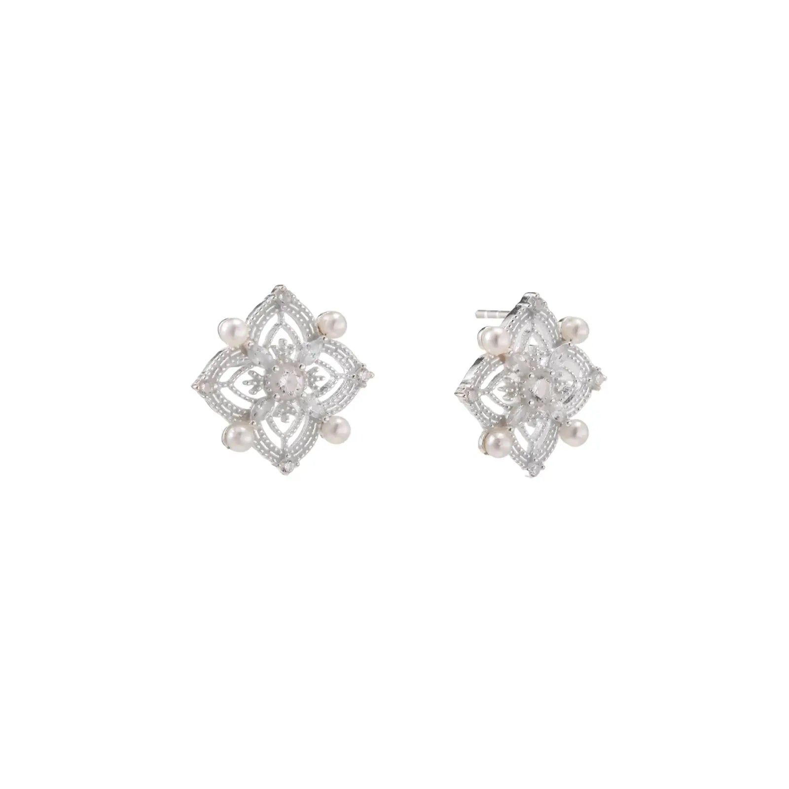 Vintage-inspired filigree meets four luminous freshwater pearls—known for nurturing feminine energy—in these intricate mandala studs.