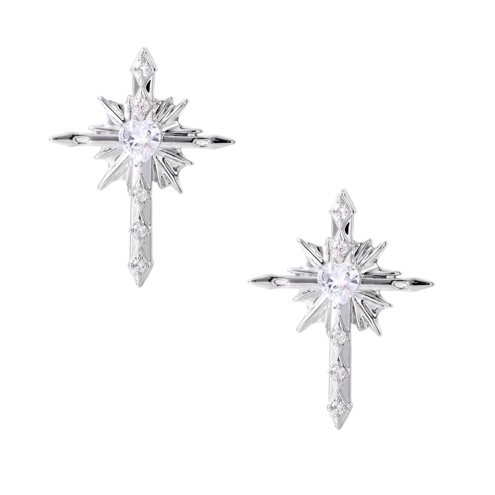 White gold-plated brass meets brilliant zirconia in these celestial warrior studs channeling confidence and cosmic power.