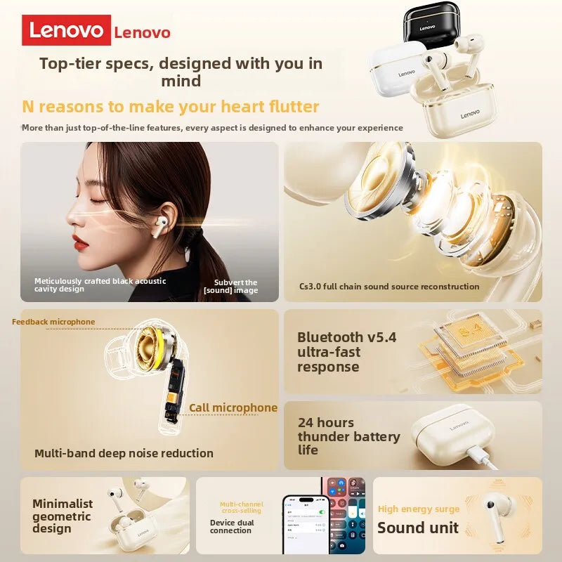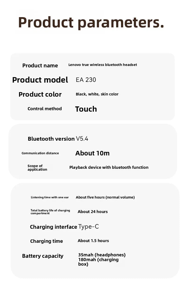 Lenovo EA230 wireless earphones deliver premium audio with Bluetooth 5.4 connectivity and active noise cancellation. These true wireless earbuds feature 13mm dynamic drivers for rich HiFi stereo sound, dual microphones for clear calls, and IPX waterproof protection. With 4-hour battery life per charge and a 180mAh case providing extended playback, they're engineered for seamless everyday use. Includes six ear cap sizes for a customized fit and arrives with charging cable and user manual.