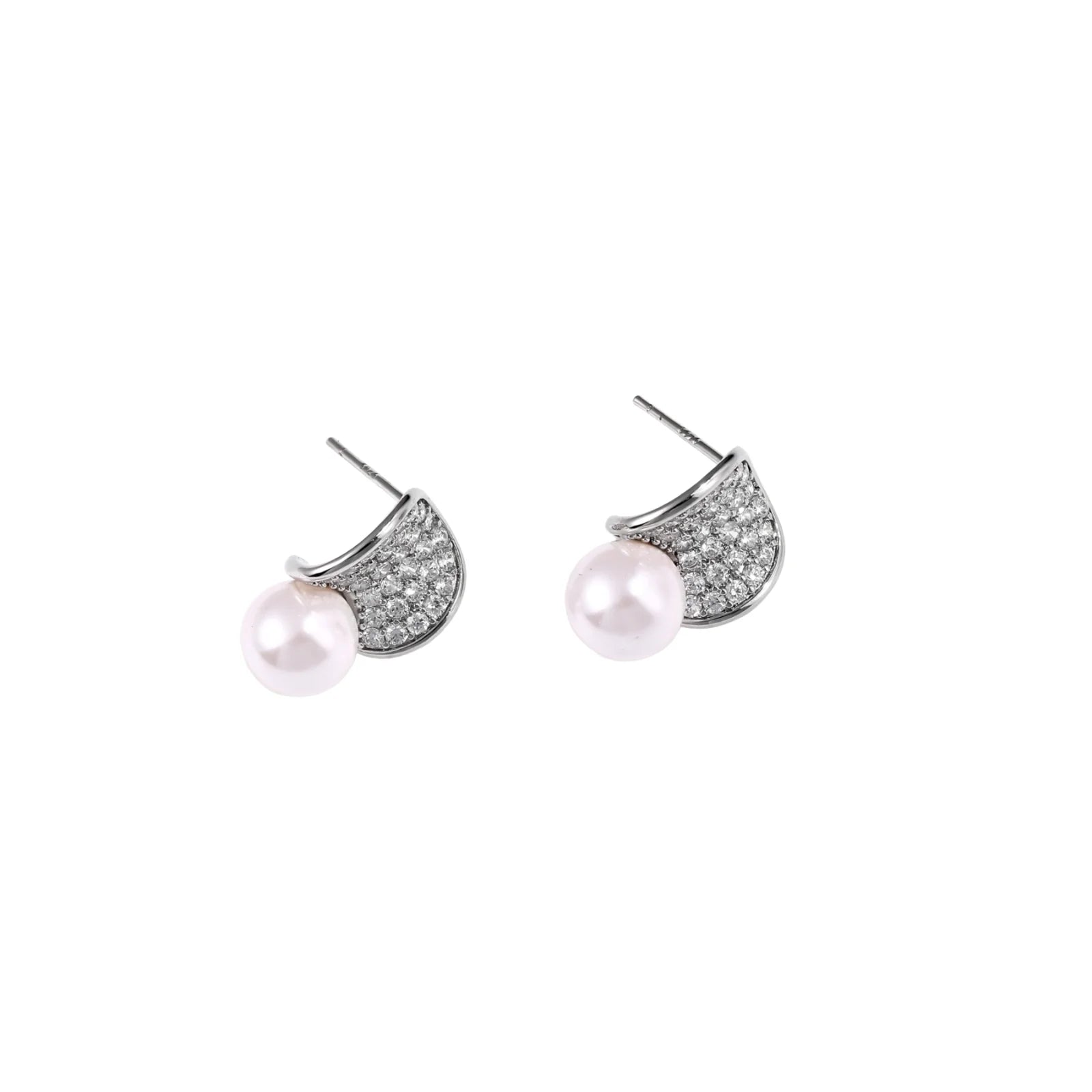 Curved pavé diamond studs in white gold-plated brass cradle lustrous freshwater pearls against cream background