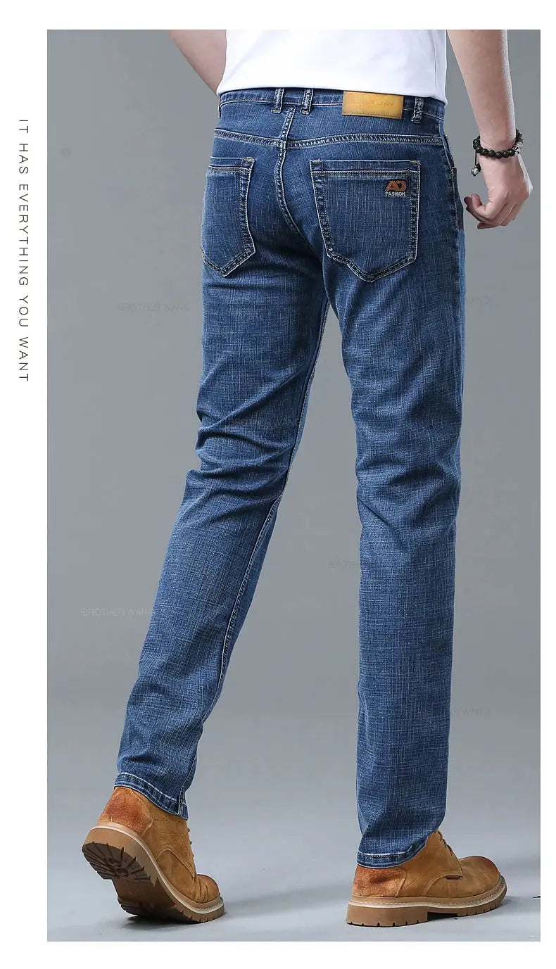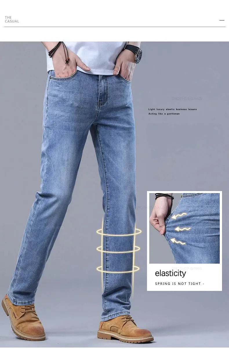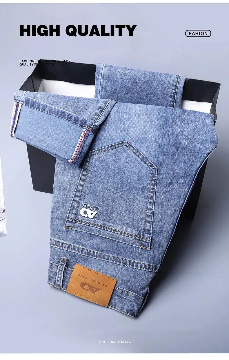 Classic men's jeans crafted from a comfortable cotton-polyester-spandex blend with subtle stretch. Features a straight fit, high waist, and medium wash with subtle detailing. Perfect for everyday wear, business casual, or relaxed outings. Available in standard sizing with lightweight denim construction for year-round comfort.