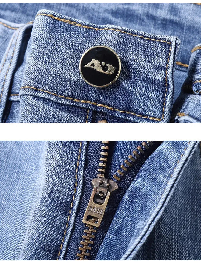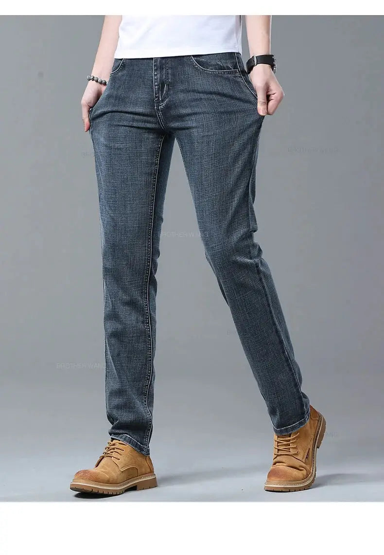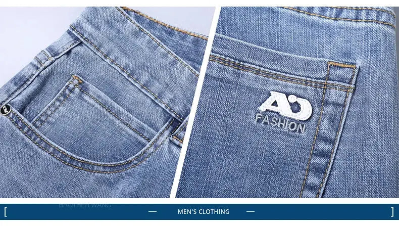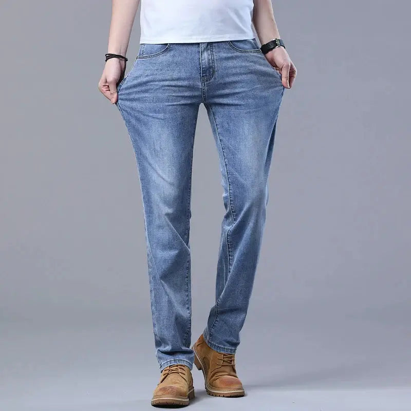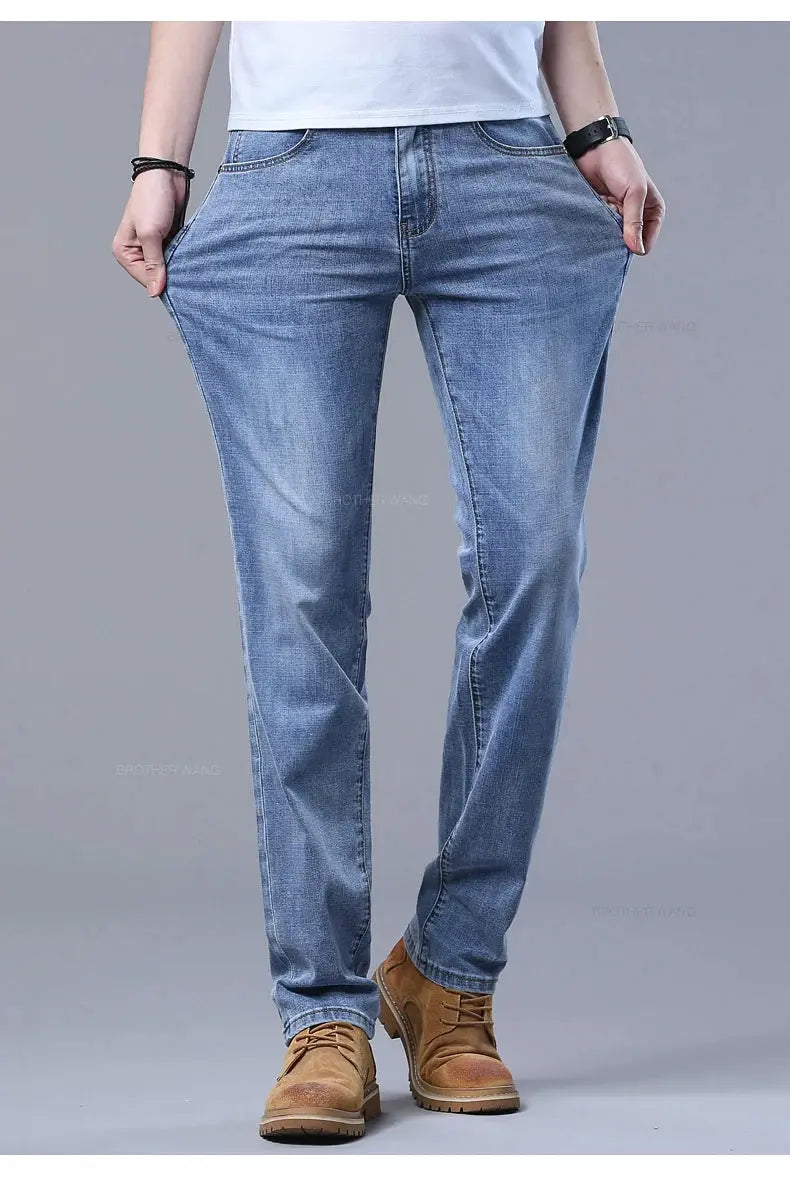Classic men's jeans crafted from a comfortable cotton-polyester-spandex blend with subtle stretch. Features a straight fit, high waist, and medium wash with subtle detailing. Perfect for everyday wear, business casual, or relaxed outings. Available in standard sizing with lightweight denim construction for year-round comfort.
