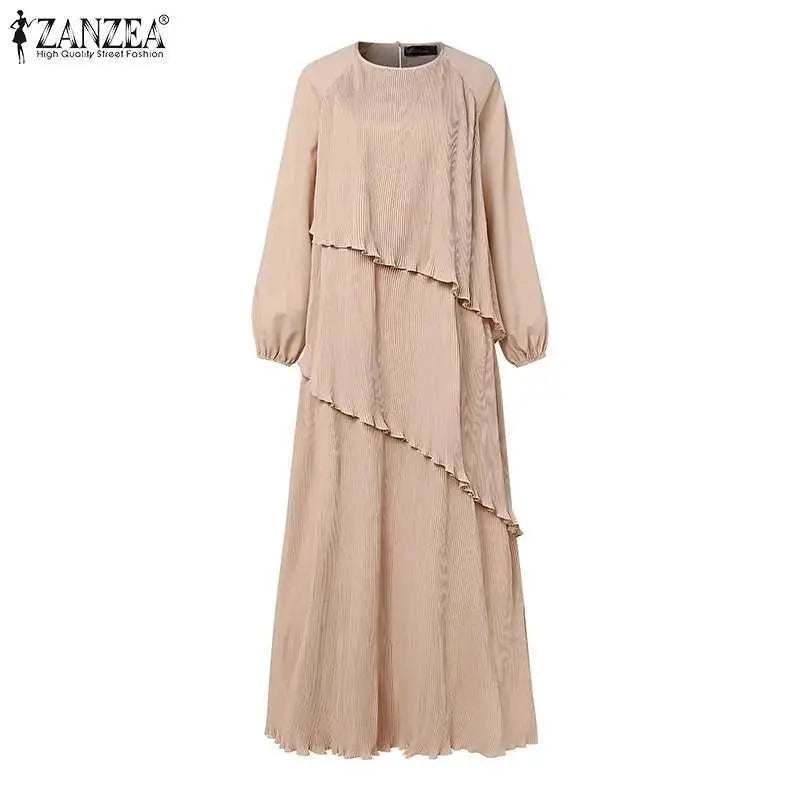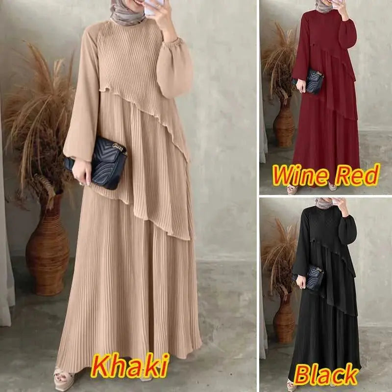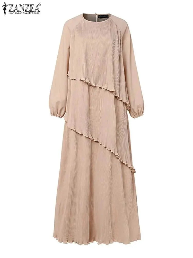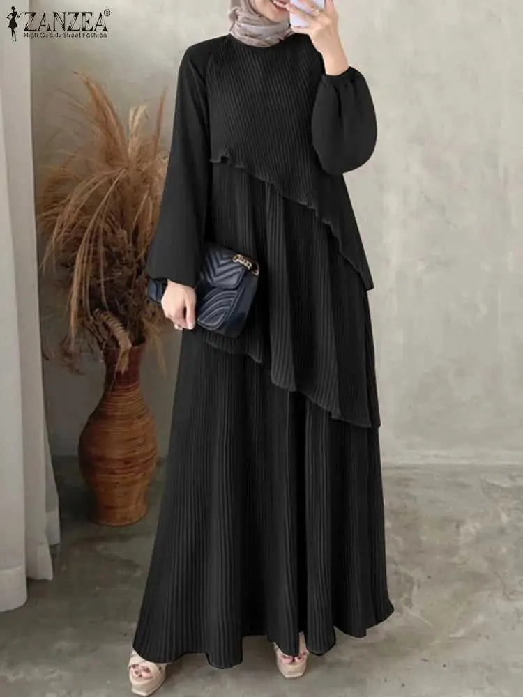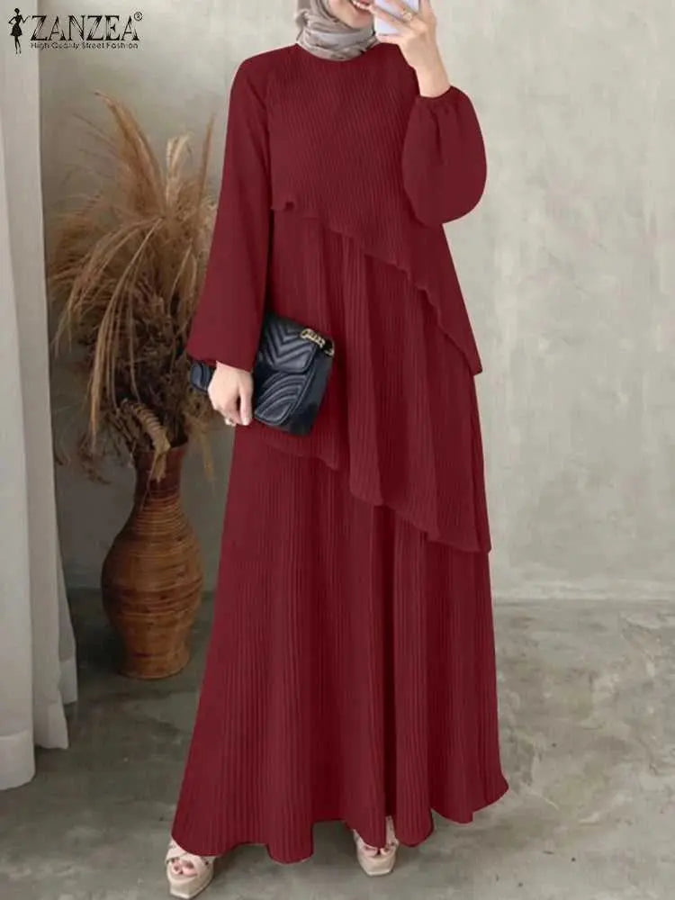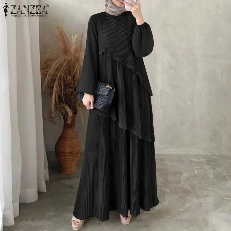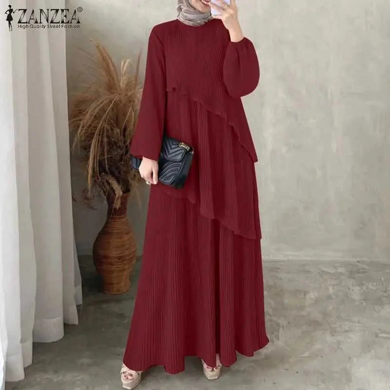 Elegant ZANZEA abaya dress featuring pleated lantern sleeves and layered design. Crafted from lightweight 100% polyester broadcloth in classic black, wine red, or khaki. Loose fit with back button closure suits various occasions from family gatherings to celebrations. Available in sizes S–XXXL with ankle-length cut. Perfect for modest fashion enthusiasts seeking timeless style.